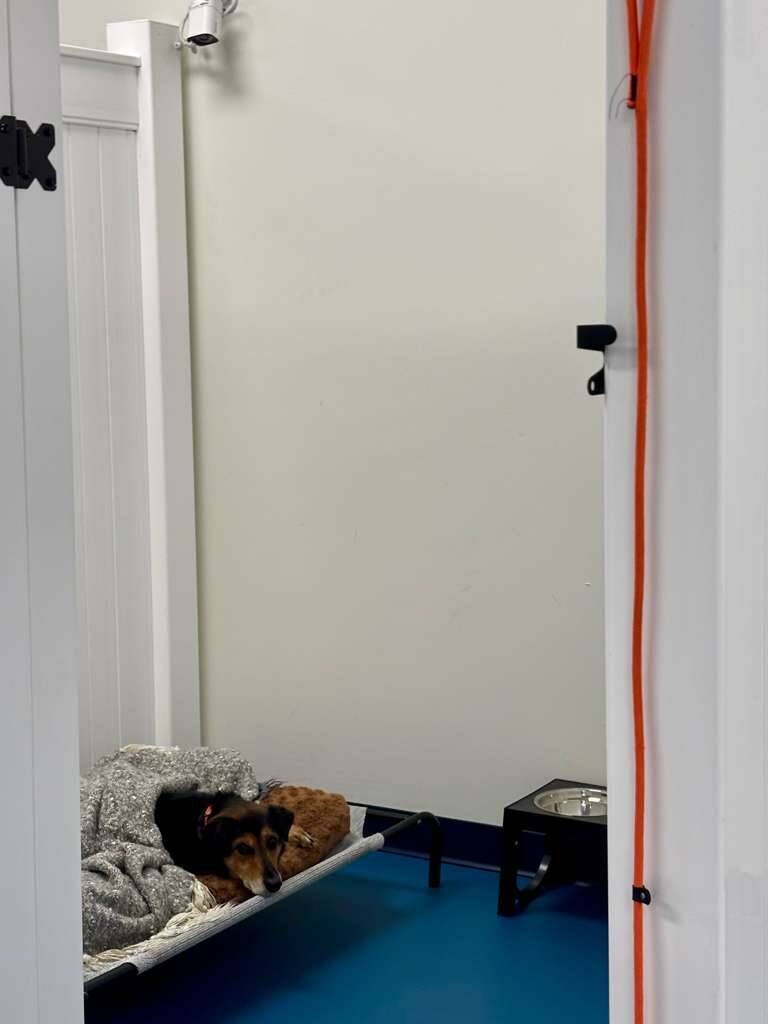 Captain’s Chambers is your pup’s home away from home — cozy suite, full-day daycare included, and peace of mind for you.